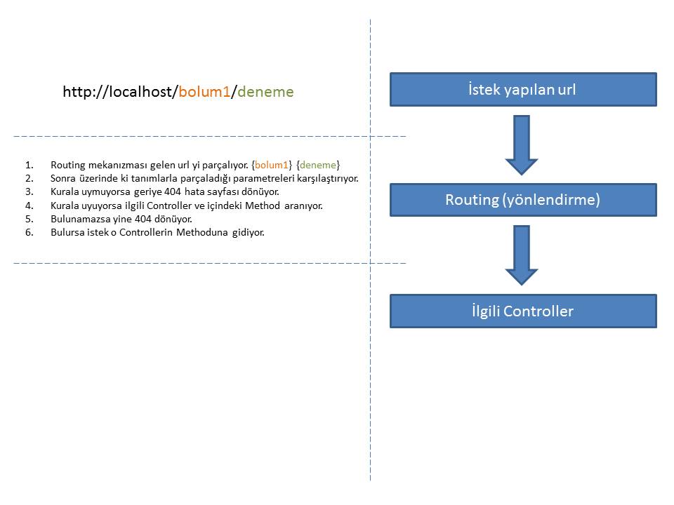 İstekte bulunduğumuz adres aslında bizim kontrolümüzün ve bu kontrolün içinde ki deneme adında ki methodun ismi. Demek ki url den bizim hangi kontrolün hangi methoduna erişeceğimizi yöneten bir mekanızma var. İşte bu mekanızmanın adı Routing (yönlendirme). Muhtemelen aklınıza direkt şu soru geldi; iyi de kontrolün adını başka, url deki adını değişik yapmak istiyorum. Maalesef bunu yapamıyorsunuz, şaka şaka