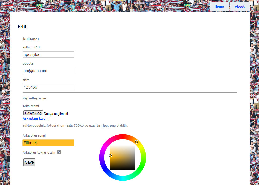 Modelimizi oluşturduktan sonra işin zevkli kısmına geçebiliriz. Modelimize ait kontrollerimizide oluşturduktan sorna, Edit.cshtml sayfasına girip ilgili düzenlemeleri yapıyoruz. Kişiselleştirme için arkaplan rengini düzenleyeceğimizden bir renk seçme paletine ihtiyacımız var, ben farbtastic i kullandım. Mevcut Edit.cshtml sayfasına farbtastic in dosyalarını ekliyoruz ve şu şekilde değiştiriyoruz.