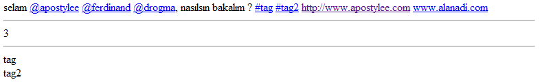[csharp] protected void Page_Load(object sender, EventArgs e) { string strCumle = "selam @apostylee @ferdinand @drogma, nasılsın bakalım ? #tag #tag2 http://www.apostylee.com www.alanadi.com";