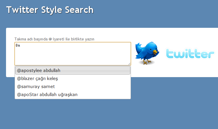 Twitter da tweet yazarken @ işaretiyle başlayıp yazmaya başladığımızda, arkadaşlarımızı bulmamıza olanak sağlayan bir arama mekanızması bulunuyor. Geçenlerde lazım oldu epey bir aradım fakat tam olarak bu işi yapan bir betiğe rastlayamadım, bende isteğime en yakın örneği bulup üzerinde bir kaç ufak değişiklikle amacıma ulaştım. Faydalandığım örneğin adresini bir türlü bulamadım, bu yüzden paylaşamıyorum Olayın temelinde jQueryUi - Autocomplete' nin Multiple Values özelliği bulunuyor.